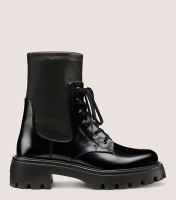 The EVERITT BOOTIE features a modern, rugged square toe and a stretch-infused shaft that nods to our signature brand code, allowing for easy slip-on without having to undo the laces. An edgy lug sole and a 50-mm block heel complete this fashion-meets-function design.